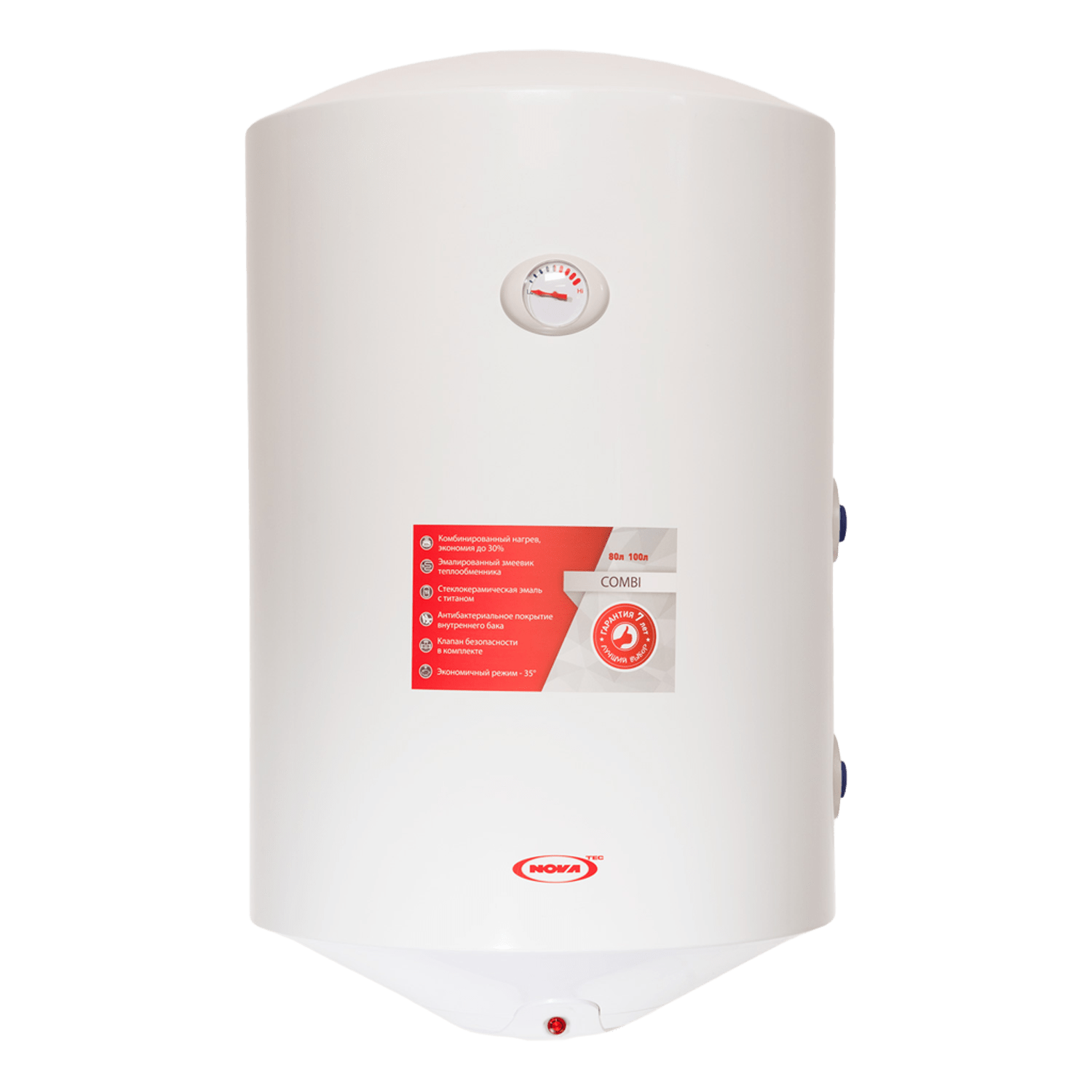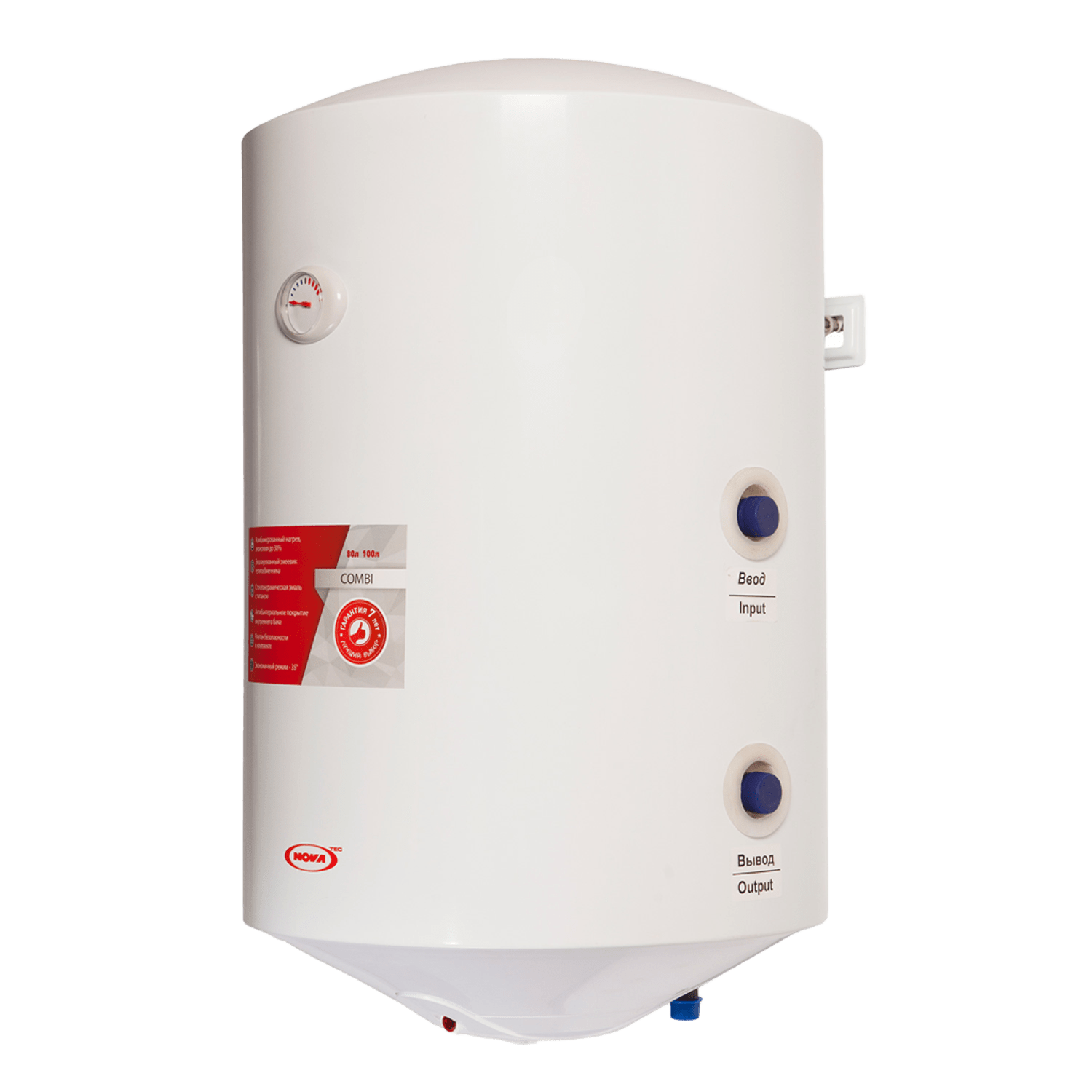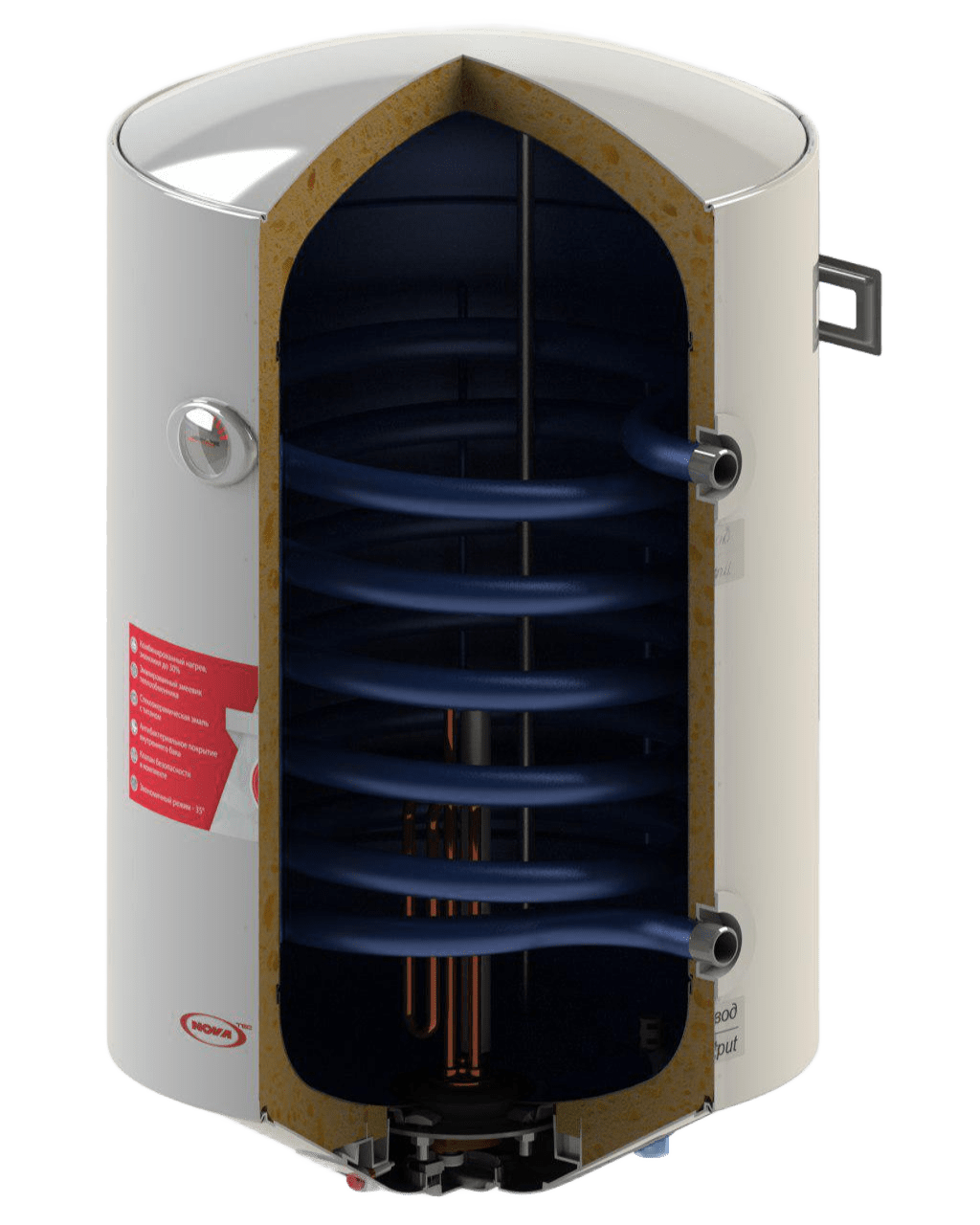 The NOVA TEC Combi series offers high-tech storage water heaters that provide maximum energy savings. The water heater is equipped with a built-in heat exchanger (coil), which allows you to connect the boiler to an external heating boiler (gas, solid fuel) or solar collectors. In summer, the water is heated by an electric heating element, and in the heating season, it works from the heating system.